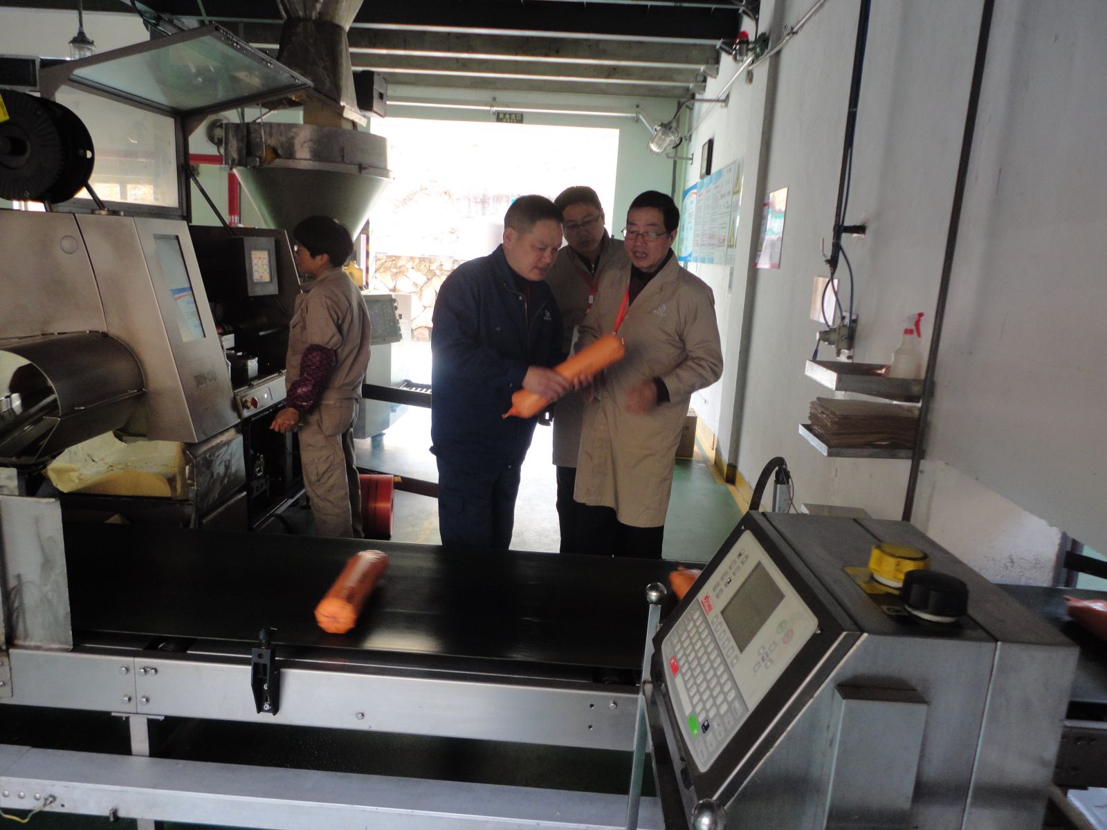 嚴主任一行深入公司兩條乳化炸藥生產(chǎn)線現(xiàn)場進行檢查指導,首先對新改進的乳化炸藥1號生產(chǎn)線監(jiān)控室和包裝工序進行檢查,當看到包裝工序目前已基本實現(xiàn)無人化操作,表示非常滿意,要求我們公司繼續(xù)推進技術(shù)進步,盡早完成1號生產(chǎn)線中轉(zhuǎn)站臺的建設(shè),并實現(xiàn)機械手自動裝車,提升本質(zhì)安全水平。隨后來到乳化炸藥2號生產(chǎn)線現(xiàn)場,當班正生產(chǎn)Φ32-300克藥卷,董事長李峰詳細介紹了目前我省正全面推廣Φ32-300克藥卷,這對生產(chǎn)企業(yè)和用戶來說是雙贏的,既降低生產(chǎn)成本,又增加產(chǎn)能,用戶使用更加方便。黃憲法處長提到小直徑藥卷應(yīng)特別注意防止中包缺支、多支現(xiàn)象,并分別對中包及成品袋的檢重裝置進行檢驗。