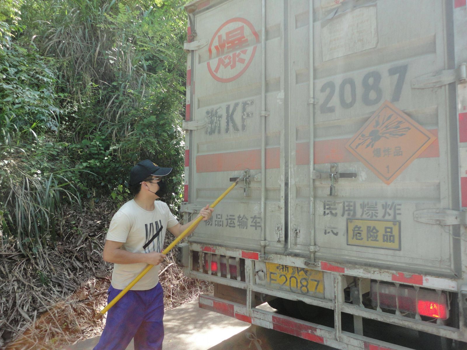 5月24日下午14時(shí),民爆物品進(jìn)庫車行駛至總庫區(qū)某處偏僻地段,被前面一輛面包車及道路中間的障礙物擋住去路,一名押運(yùn)員下車查看情況,突然兩名蒙面“歹徒”持刀沖出,開始了預(yù)謀已久的搶劫行動(dòng)……