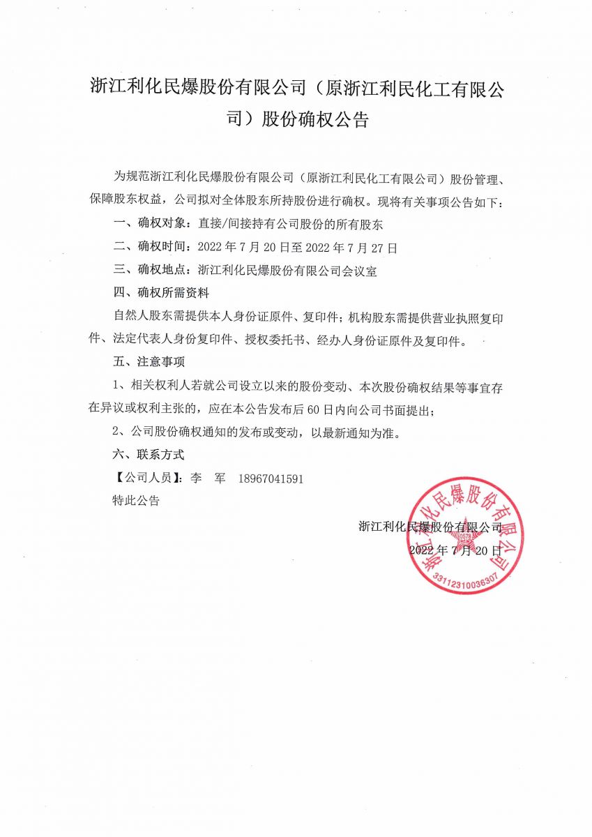 浙江利化民爆股份有限公司(原浙江利民化工有限公司)股權(quán)確權(quán)公告